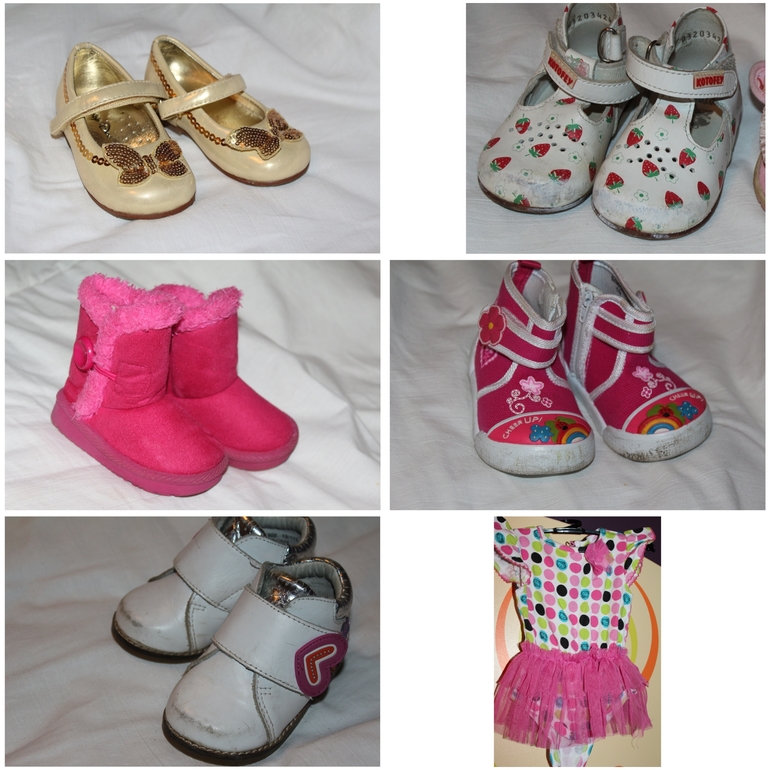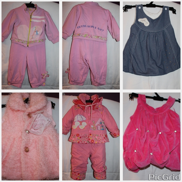 Платье 500 р Золотые туфли 200 р 13 см по стельке Костюм тёплый осень/весна от 6 мес до 1,5 лет за счёт отворотов 350 р Тёплые сапожки 200 р 20 размер Розовый костюмчик 150 р Серый костюм 100 р ( пятна там нет) Остальное по 50 руб