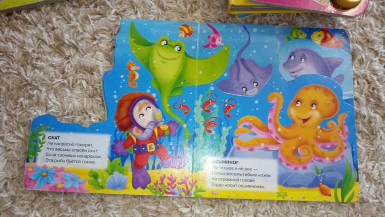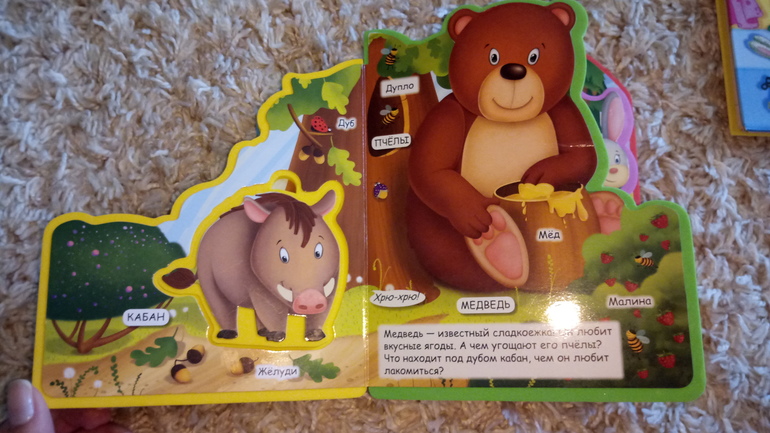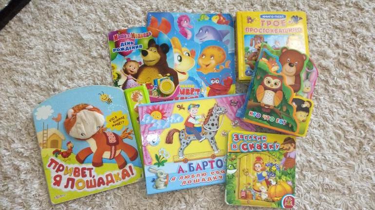 Большой частью брала книги картонные, чтобы дочка не смогла их порвать, книги с клапанами, пазлами и музыкой.