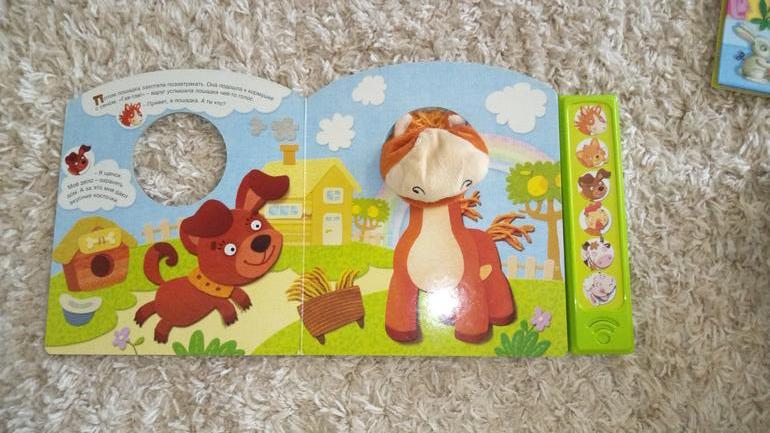 Первая книга от Азбукварика. Здесь можно подставить руку в голову лошадки и изображать движения, также имеются звуки и озвучивания животных. Вообщем с этой книги мы выучили некоторых домашних животных.