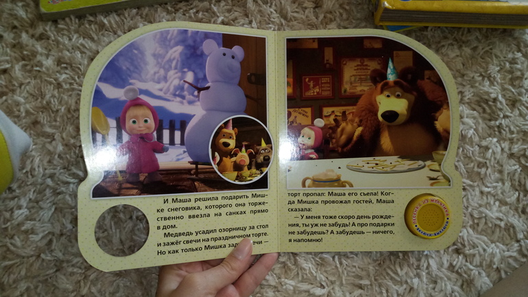 Книжка Маша и медведь. Сразу скажу мы не поклонники этих мульт героев. Просто дочка любит песни слушать из мультфильмов, а тут как раз и работа пальчиком, и песня любимая.