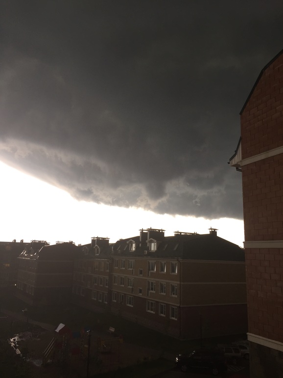Поднялся сильный ветер. Внезапно набежала черная туча, такая темная, что в 7 вечера на улице даже фонари включились. А потом она начала закручиваться! Быстро-быстро. Появился хвост и начал опускаться вниз.
