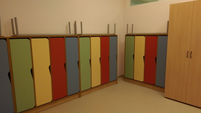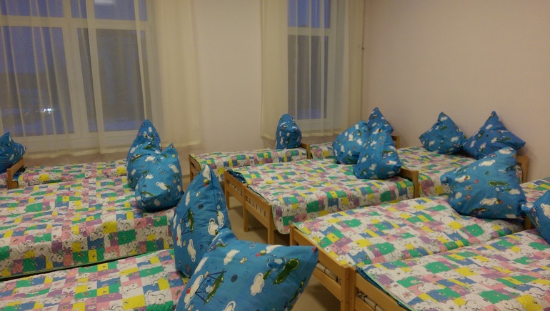 Планируется создать логопедическую группу, возможно две. На первом этаже две ясельных группы, кухня. Пол в ясельках с подогревом. Все новое, яркие ковры, у малышей есть сухой бассейн с шариками, маленькая горка. Игрушек много. Кроватки такие крохотные. В туалете горшки по полочкам.