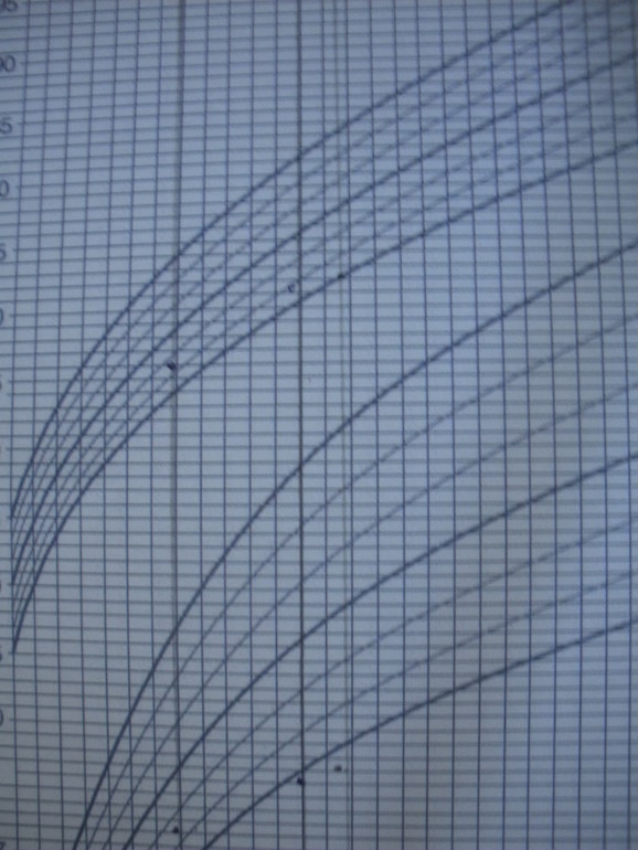 ещё мы сходили на прививки и замеры и опять результат набора веса плачевный,надо ехать к врачу за анализами,вот таблица нашего набора.точки это наш вес ,вверху таблица роста,вроде пока попадаем в параметры.