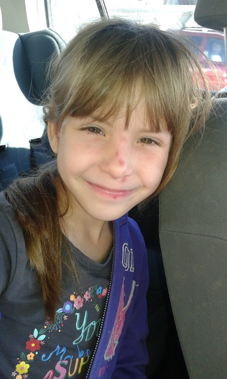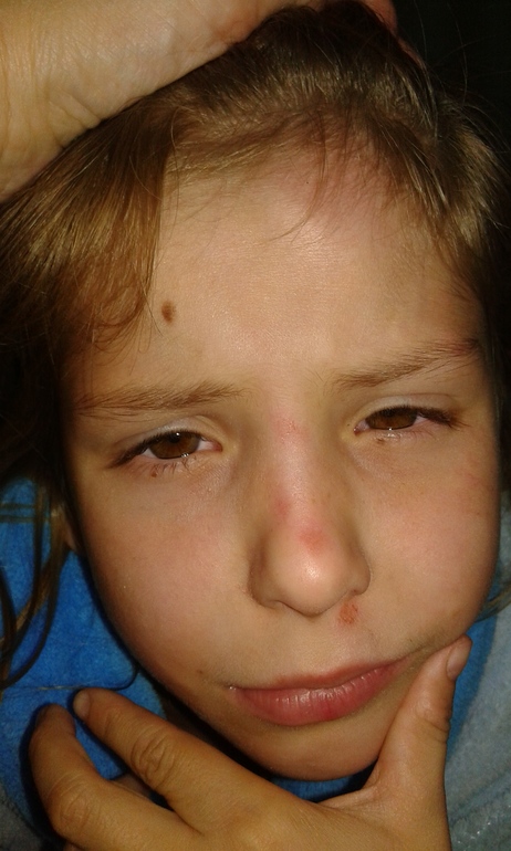 anastasia 6 yearsНу я же говорила что у всех принцессы, а у меня Настя.в сумерках решила догнать меня на велосипеде (пока я с коляской гуляла).не ровный асфальт сыграл злую шутку и Настя прямиком врезалась в бетонную забор.я услышала плач из далека.результат плачевный, но могло быть и хуже. Шлем на днях выкинули из за износа.в общем:куриное яйцо на голове, разбитый нос кровоточил, болели зубы, коленкииии.фото для памяти.в госпиталь не поехали.наблюдала дома.рвоты не былo.так что сотрясения вроде как не было.