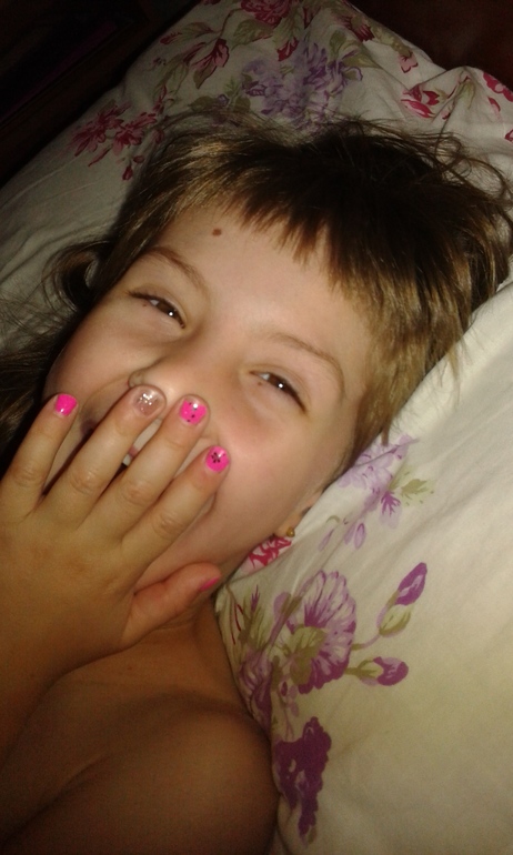 Не делала ничего сегодня.поехала к приятельнице.она косметолог.сделала мне на пробу крем для лица.лёгкий,летний,с натуральными добавками.попробовала на мне новый шилак.прежняя марка не держалась и 3 дней.(надо будет на педикюр ещё к ней обратится.)сделала она и мыла разного.надо недельку подождать,чтоб мыло настоялось.в обед наших дочек забрали в KFC.наелись всякой дряни,напились колы.девчата наигрались в детском уголке.Тимоха тем временем дома спал под папиным присмотром.потом мы его забрали,я купила пироженок и опять мы натрескались.потусили ещё дома у приятельницы.она девчонам тоже маникюры слелала(козы маленькие).пока мы расслаблялись в кухне,девчёнки решили поиграть в парикмахера и обкромсали моей чёлку.так что сегодня и у них день красоты.в 6 смотрю дочка притихла.уехали домой.искупались и лежим в кровати смотрим кино про докторов.вот такой он-день ничегонеделания.