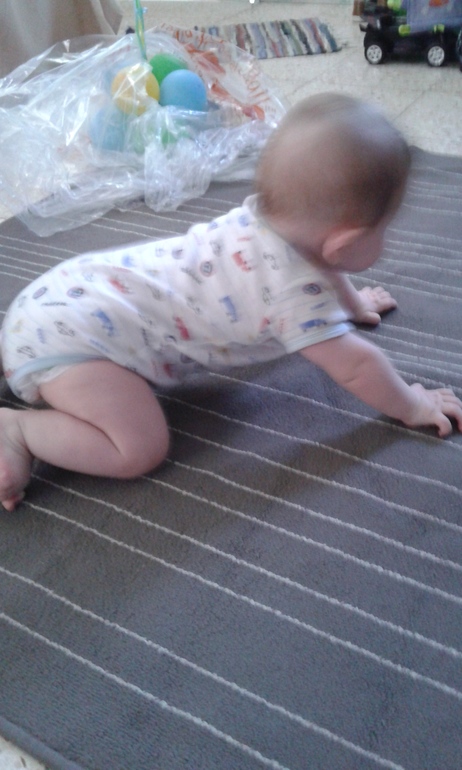 сидит сам,уверенно,стучит руками,игрушками.играет детским центром.ползает слабо,предпочитает сидеть,но если узреет открытую дверь,то старается доползти туда,ещё лезет к телевизору.если придерживать,то крепко стоит на ножках,сам уже пытается подтянутся куда нибудь,но пока нет попыток встать.вчера приготовила с овощами индейку.пошла хорошо.два дня ходил в туалет странно,часто и немного жидко,со слизью.но не понос,потекли слюни,прям водопад.во рту ничего не видно,только малюсенькая точка на нижней десне,но не зуб это.может так начинается подготовка к зубам?один раз спал всю ночь,с 21.00 до 6.00.щастие то какое,но сегодня опять проснулся в своё время покушать.