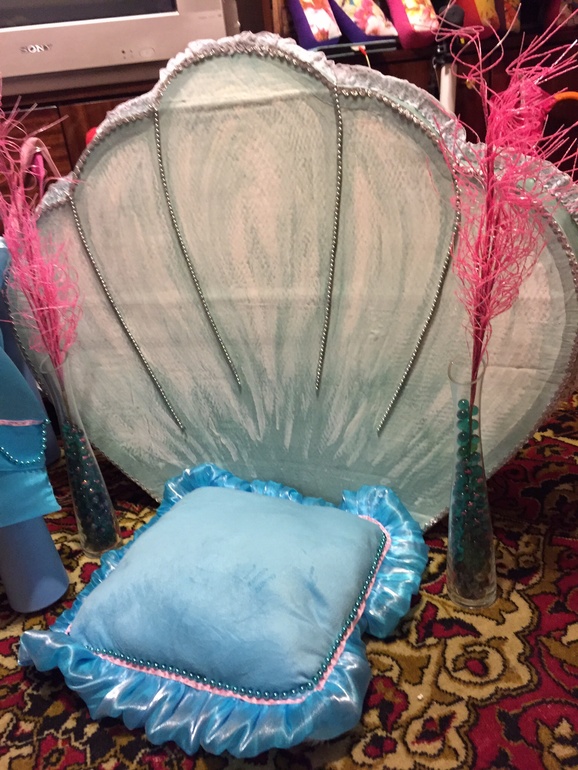 Ракушка из картона делали сами, водоросли в вазочках, на стене висели еще бумажные водоросли но не сохранились, подушечка с жемчужиной, скатерть на сладкий стол в едином цвете и материале с подушечкой. Шпажки русалки с пайетками, несколько шпажек просто с картинкой русалки, трубочки и держатели для салфеток, стаканчики с ложечками под желе, и ракушки для россыпи на стол. Цена полного комплекта 2000 руб.