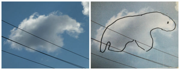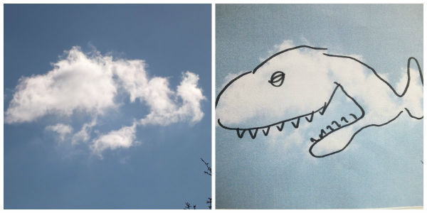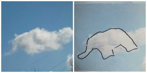 Затем я показывала ребенку фотографии, и он мне рассказывал, на что похоже. Тут уж мы развернулись. Он говорил, где голова, ноги и т.д. Все облака на что-то похожи, иногда совершенно неожиданно для меня. А я потом просто обвела облака черным фломастером, следуя четким инструкциям сына.