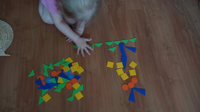 Моторика: сложили одуванчик из напольной мозаики. Тут все просто и понятно. И Аня мозаикой увлеклась надолго.