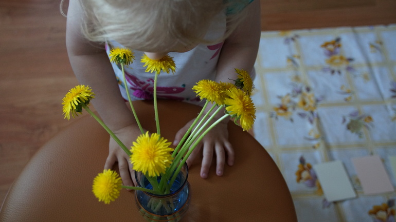 Домой мы принесли букетик одуванчиков. Вдохнули аромат, настроив на дальнейшую работу правое полушарие, подключили развитие речи: подобрали слова для описания запаха: сладкий, медовый, цветочный. Букетик перекочевал на подоконник для дальнейших наблюдений.
