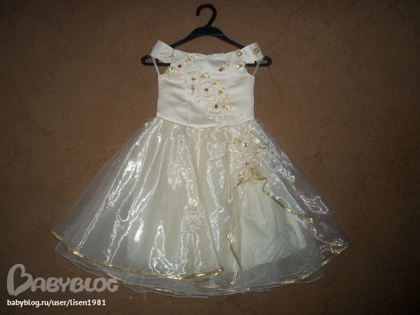Цвет кремовый. Юбка пышная, тройная. Платье украшено золотой каймой и камушками. Подойдёт на возраст с 2 лет(будет до пола) до 4,5 лет(будет как на фото 2).