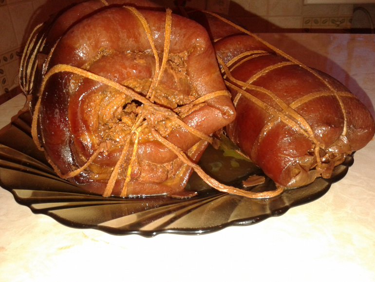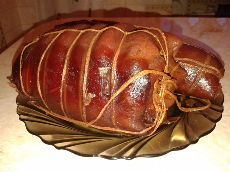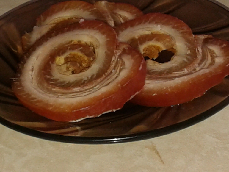 Подготовить сало:помыть и обсушить салфеткой. Сделать натирку:положить в чашу комбайна чеснок,паприку,растительное масло,соевый соус,черный перец молотый,чили крупного помола,хмели-сунели,взбить все до однородной массы. Затем распределить все это по всей поверхности сала,и немного повтирать,при желании можно сделать продольные надрезы.Затем как можно туже свернуть рулетом и туго перевязать бечевкой или прочной нитью.сделать рассол из расчета 2 ст.ложки соли на 1 литр воды и 2 горсти луковой шелухи.Варить из расчета на 1 кг рулета-1 час варки(сначала на сильном огне довести до кипения,затем убавить до среднего,чтобы не очень сильно бурлило,и продолжать варить).после окончания варки остудить рулет в рассоле,прижав тарелкой с грузом.Хранить можно в морозилке.