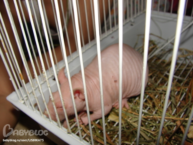 Поразительно, но нам подарили крысу в зоомагазине! Рите очень нравилась лысая крыска Она ходила туда каждый день на нее смотреть. Я хотела маленькую, эта великовата была. А хозяин как то увидел Риту над крысой и сказал чт крыса все равно бракованная ( один глаз не видит) и сказал что если хотите, забирайте даром. Ребенок счаслив. Только я не знаю как ее приручить теперь. Она уже взрослая и довольно дикая. Грызонула меня за палец. А я в инете вычитала что ей можно вернуть зрение. Похоже у нее просто воспален этот глаз. Его надо мазать мазью и капать. Но как если она кусается? Мизинец мне насквозь прокусила. Вот она у нас какая:)