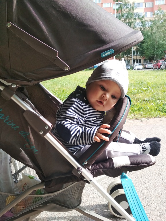 Более-менее нормально ездит в коляске. Привыкает.