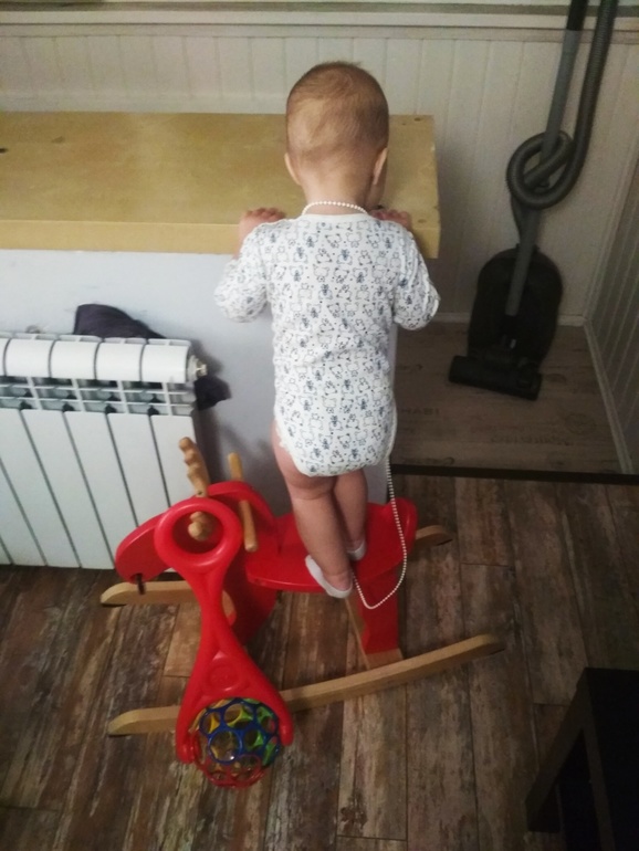 11 декабря пошла сама. Правда она об этом не знала - папа ей говорил, что ее держит, и она шла)) это в комбезе на улице было, поэтому там сложно самой определить было, я полагаю. Теперь по улице может пару шагов сделать, если незаметно отпустить комбез. Дома не желает.
