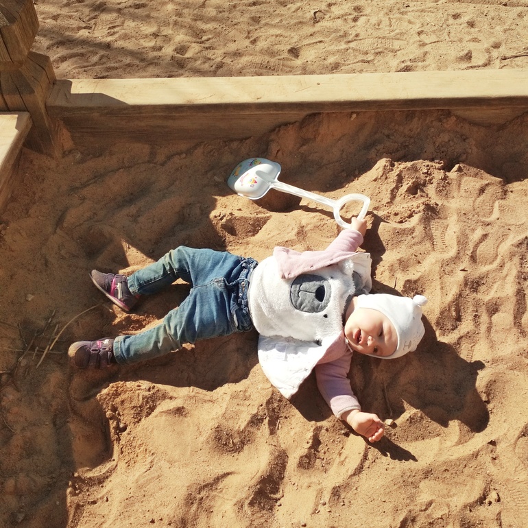 В песочнице ещё не были - у нас песок почти кончился, а новый пока не завезли.