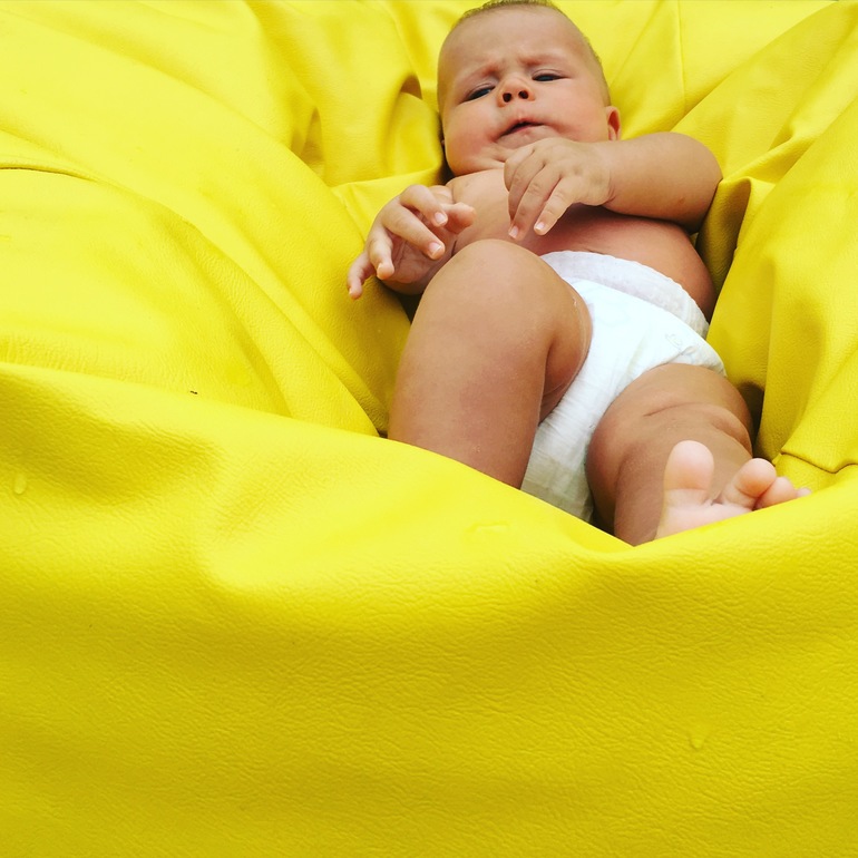 Всё также лежит на спине и не хочет переворачиваться. Максимум на бок, да и то, только для жадного захвата соска.