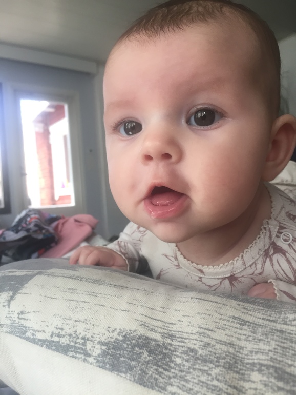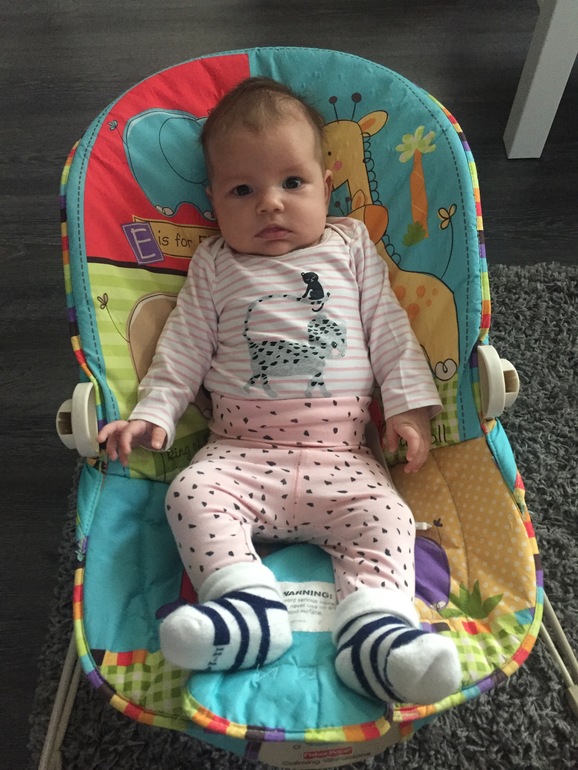 На приёме почти в 4 мес : вес 6720 рост 66см, прибавила мало поэтому мама начала усердно откармливать:) ввели прикорм