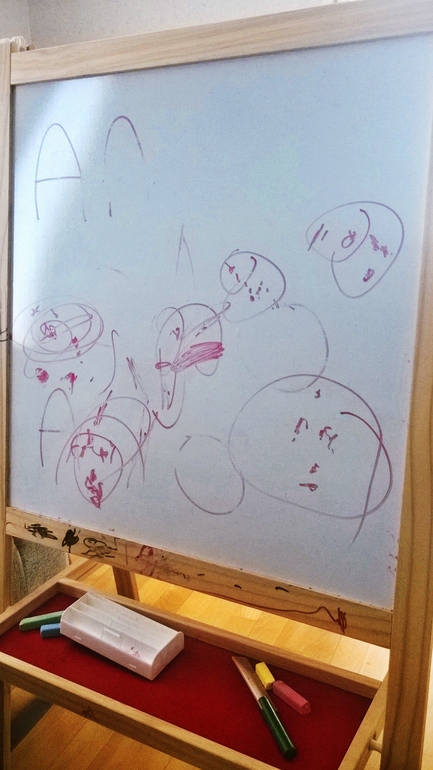 Любимый зайчонок...и , впервые нарисовал всю нашу семью! Мама (внизу справа) получилась лучше всех, видимо потому что с нее он начал, а остальных уже шлепал так))) Элиасу 2,6