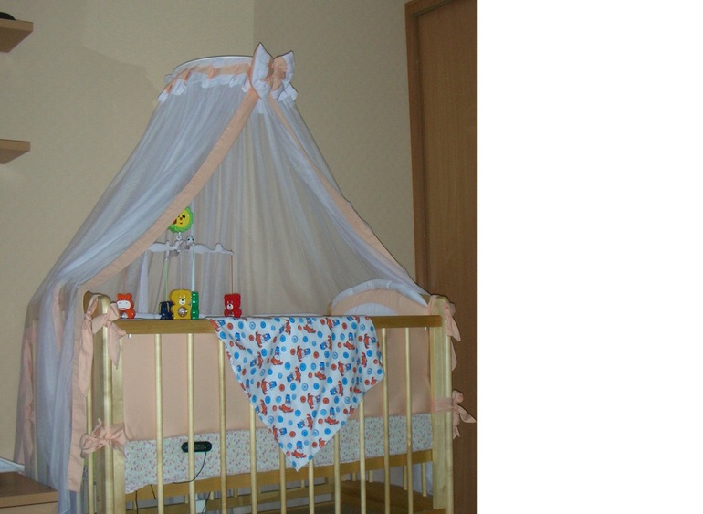 Бортики в детскую кроватку и балдахин. От разных комплектов. У бортиков оторвано несколько завязок, но они не потеряны и их можно пришить. Балдахин в полном порядке.