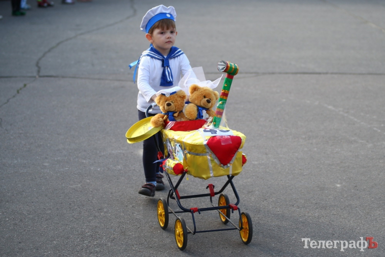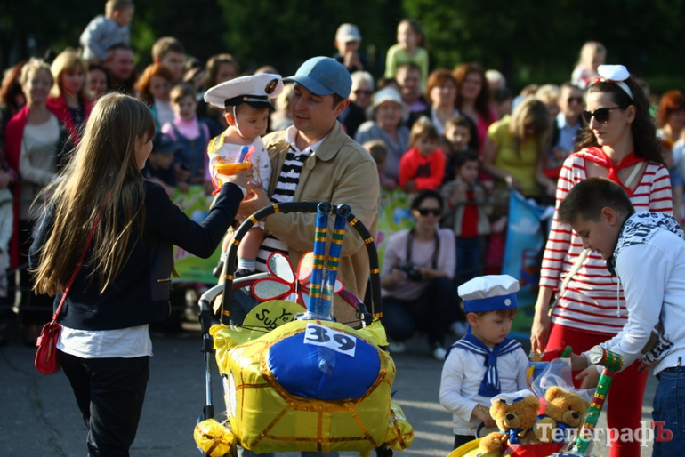 Наши коляски будут двумя желтыми подводными лодками, а дети морячками. В этом году технически особо не заморачивались, а больше на костюмы и атрибуты время потратили. надеемся на удачное выступление :) завтра ждем праздника и побед :))