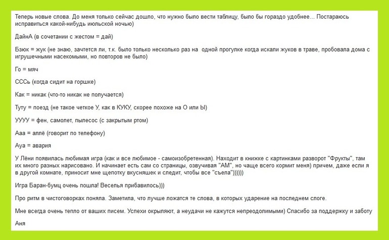 про очередные новые слова повзрослевшего на 2 месяца сына из этого же письма (Лёне к этому моменту уже 1г5мес)