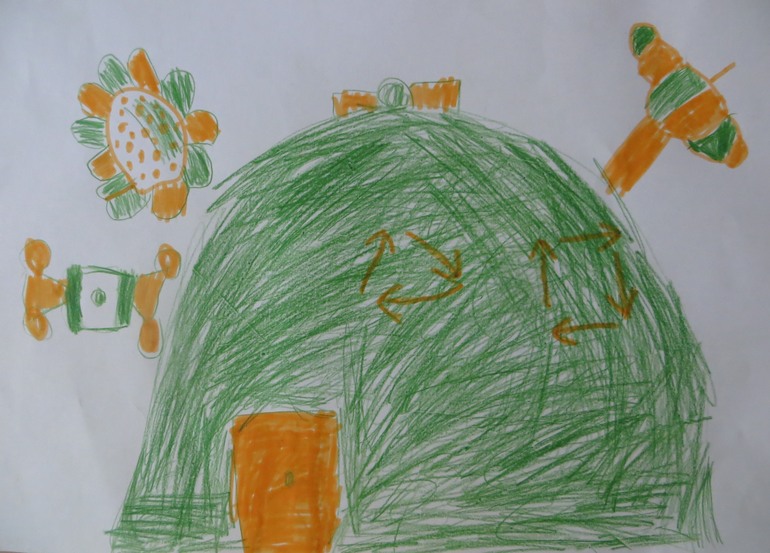 Когда пришли, попросил в комнату не заходить, там мол для меня сюрприз готовится. Краем глаза видела, что это какая-то зеленая дуга. Которую потом Степ превратил в "Станцию переработки". Слева направо над зданием станции нарисованы: бантик, цветок, на крыше станции- мигалка, и справа - антена )