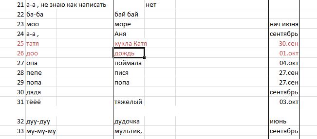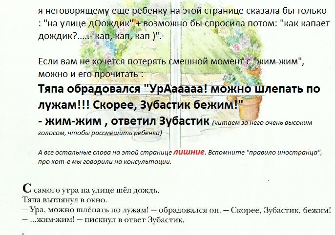 Я тогда предлагала из всего текста этой страницы сосредоточиться на слове «дождь» и оно появилось через 1мес 1 неделю. Не только из книги конечно же, дополнительно мы придумывали игры, чтобы привлечь внимание к этому слову, сделать его понятным ребенку, насколько это в силах взрослых )