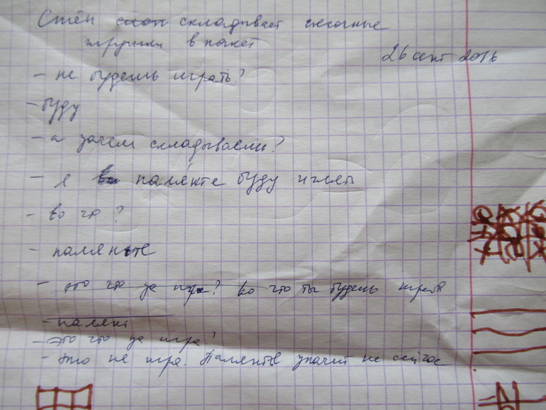 А вот почему вспомнила про это сегодня. Нашла у себя старую запись разговора со Степой (на листке записано 26 сент 2016г, значит Степе здесь 4г 8 мес). Он давно, много и правильно говорит, но видно, что слова из категории «время», осваиваются позже остальных. На них нельзя показать пальцем и нелегко сделать понятными. ..