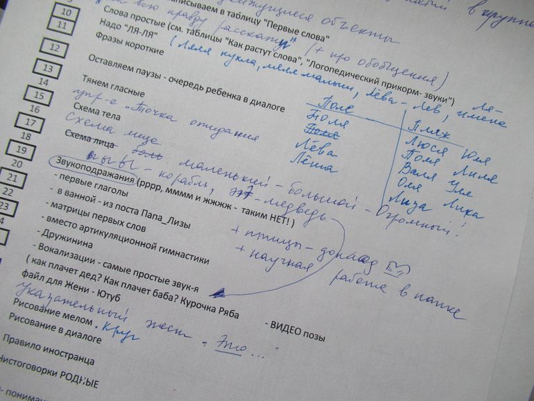 Для меня это новый виток, пытаюсь уйти от индивидуального консультирования и работать с мамами в группе. Составила несколько чек-листов, чтобы упростить обратную связь от мам, видеть картину происходящего и замечать успехи каждого, даже самые маленькие успехи ) До первых тридцати слов, это особенно важно. Потому что «первая тридцатка» всегда норовит исчезнуть)). Мамы на форумах часто пишут: «говорил, но слово пропало», «раньше говорил...».