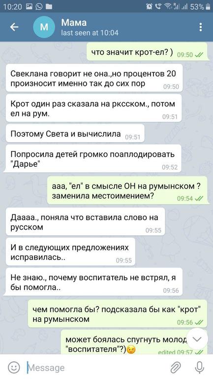 Поняв, например, что "крот" не румынское слово, в следующих предложениях заменяла его румынским местоимением "он". Плюс еще некоторые незнакомые ей на этом языке слова заменяла на известные.