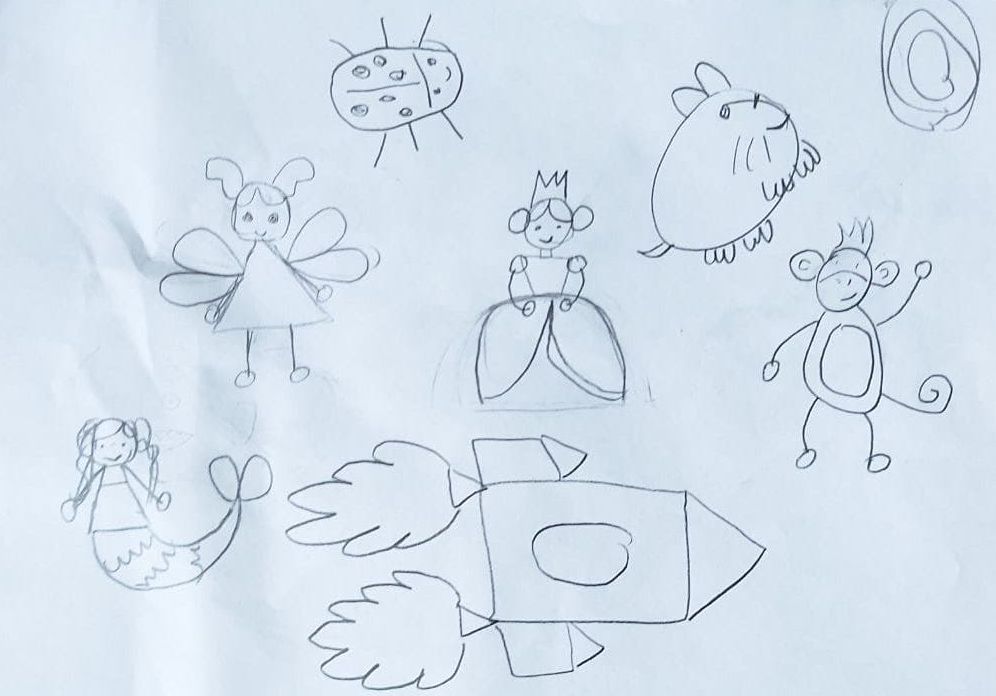 Чуть нервничал, п.ч. девочки с их нарядами получаются пока плохо (на его взгляд плохо, я не оцениваю). Поработал не только карандашом, но и ластиком (я говорю, рисуй рядом, если что-то не получилось, не надо вытирать. Не хочет так).