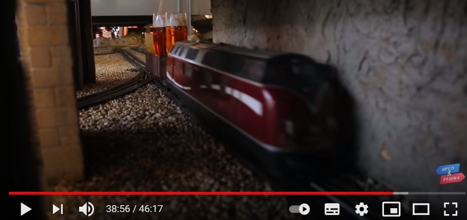 Удивил меня пару раз пока смотрели. Увидев рельсы в пивном баре, сказал, что по ним можно заказ клиентам доставлять.