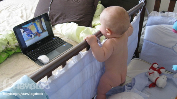 сначала стоял просто на коленочках,мы тут же опустили бортики и вот теперь мое сокровище виртуозно карабкается по бортикам и встает)))