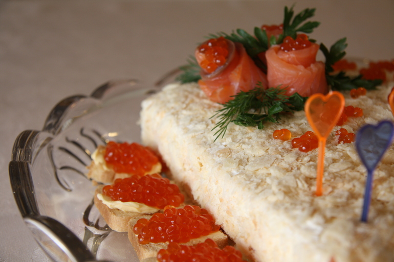 С рыбой: Каждый корж намазать легким творожным сыром типа Бонжура или Альметте и переложить тонкими ломтиками малосольной рыбки. Украсить по вкусу и желанию)