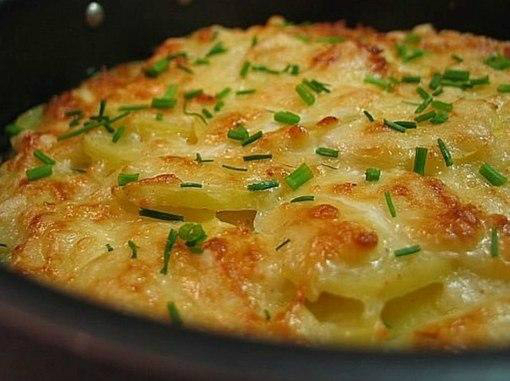 1. Отобрать крупные неповрежденные картофелины приблизительно одного размера, вымыть, очистить от кожуры и нарезать кружками толщиной 2 мм. Сыр натереть на крупной терке. 2. Три четверти сыра смешать в миске с молоком и яйцом. Добавить молотый мускатный орех, свежемолотый черный перец и приправу для картофеля. Тщательно перемешать, слегка взбивая. 3. Чеснок очистить, разрезать вдоль пополам. Форму, в которой будет запекаться картофель, как следует натереть чесноком, затем смазать сливочным маслом. 4. Разогреть духовку до 200ºС. Картофель выложить в форму так, чтобы каждый кружок немного заходил на другой Залить картофель сырной смесью. Сверху посыпать оставшимся сыром и уложить кусочки сливочного масла. Поставить форму в духовку, запекать 45 мин. Подавать горячим, посыпав мелко нарезанным зеленым луком, обжаренными кольцами репчатого лука или обжаренными полосками бекона.