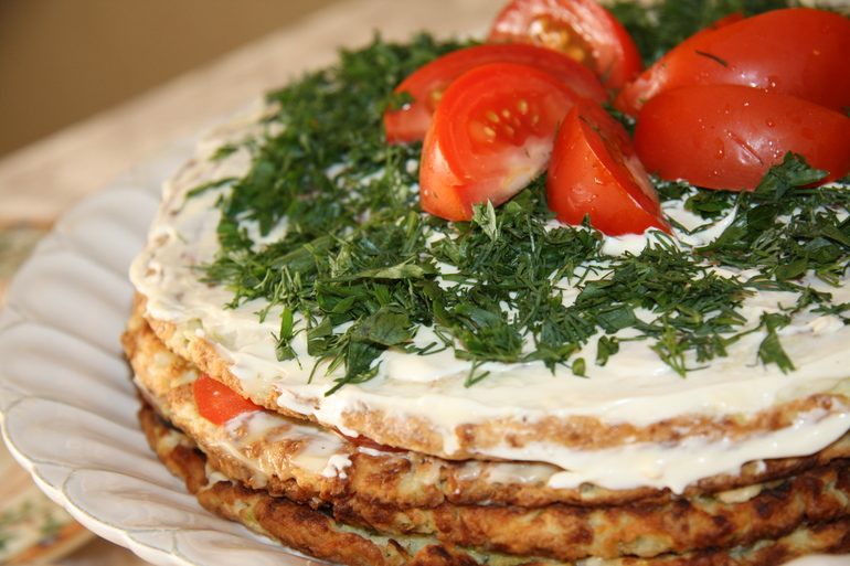 Каждый блинчик покрыть соусом: сметана+майонез, зелень, соль,чеснок, и сделать прослойку из тонюсеньких ломтиков помидор. Прослойки могут быть разные от обжаренных грибов до моркови по-корейски. Я люблю аромат и вкус обжаренных кабачков, поэтому такие сложные прослойки не делаю)