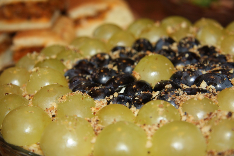 После того, как будет выложен и промазан последний слой, начинаем выкладывать виноград - с центра, плотно друг к другу по всей поверхности. Край блюда декорируем петрушкой.