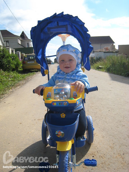 Нам такой же подарили, только ужасного кислотного розового цвета. Настюшке очень понравился, не отходит от него. Но там не работает тяга, эта железочка по середине оказалась без резьбы, ее забрали дарители поменять, и до сих пор мне не вернут ее обратно, так и лето закончится, а мы еще на улице не катались.