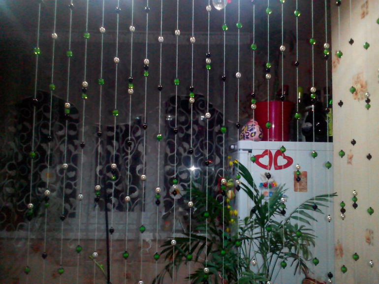 Ну а потом блуждая в просторах инета я наткнулась на шторы из бусин, и прямо загорелась я иметь такую красоту у себя на кухне. И вот три вечера работы- и такая красота украшает мою кухню))))