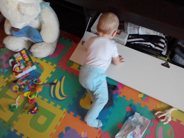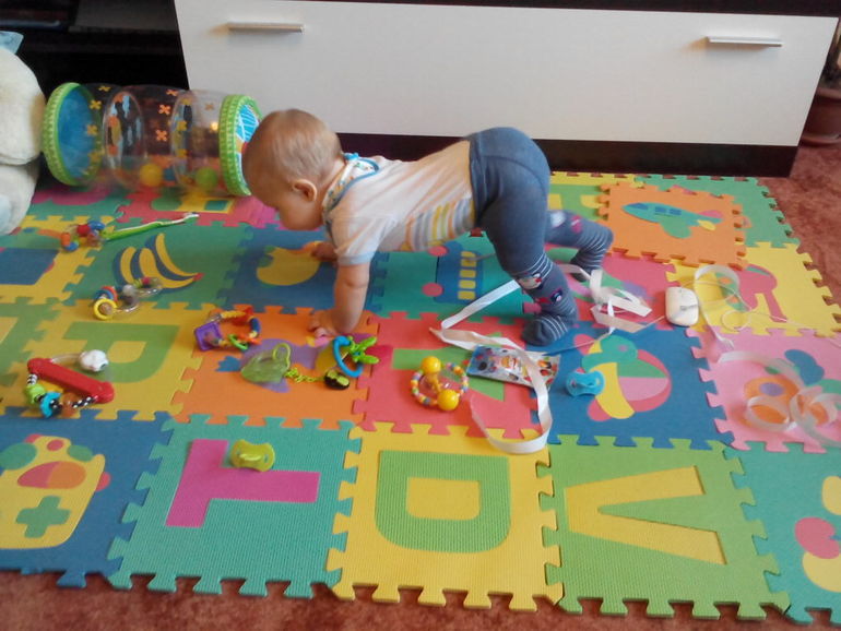 Вообще Влад очень много в этом месяце освоил, начал садиться, ползать и очень активно пытается вставать- но пока получается на коленки без нашей помощи. Любопытка ещё тот....попробуй шкаф оставить открытым- тут же ревизию наведет)))) Характер тоже огого....попробуй что то забрать у него- сразу в крик...но ничего...личность же))))