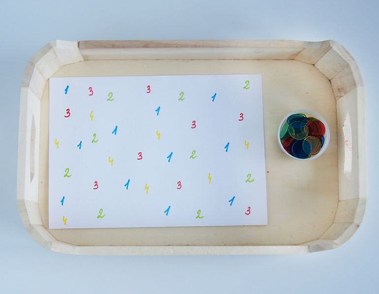 Поднос математический. Сейчас у Тим интерес к символам (цифрам и буквам). Он прекрасно ориентируется в количестве. Поэтому теперь мы потихоньку приступаем к изучению цифр. Тут лист с цветными цифрами и кружочки разных цветов. (не могу вспомнить их название =D) Соответственно каждой цифре соответствует круг определенного цвета.