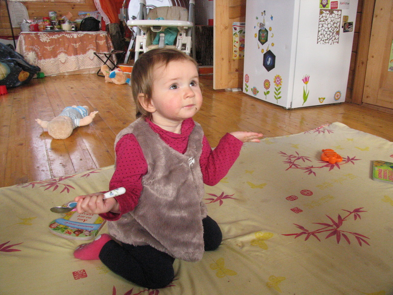 Есть стала несколько аккуратнее. Кормлю ее смешанно - частично разводными кашами из коробки (не подсаливаю и не подслащиваю), мясом из банки (не каждый день, но все-таки сцыкотно мяса совсем не давать). Остальная еда вся наша - крупы, супы, овощи, яйца, молочка. (делаем свою в йогуртнице). Обожает сыр. Печенек никаких не даю, в качестве снеков - хлебцы - в последнее время нравятся Доктор Корнер, они мягкие. Фрукты как не любила, так особо не любит. Немного может яблочко и грушу погрызть, бананы не идут совсем. Из напитков - вода и чай с молоком. Сися все еще фигурирует, но уже несколько меньше. Сосет на ночь и утром, может ночью подсосаться разок. Ну и днем тоже один-два раза подсасывает. Со стулом тоже все в порядке.