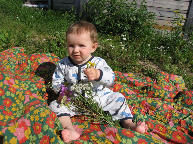 Что имеем к году - говорит "мама", "папа" и "дяй") - последнее появилось совсем недавно. Ходит по 8-10 шагов подряд самостоятельно. Слезает-залезает на диван уверенно. Любит рассматривать картинки в книжках, искать спрятанные игрушки, уже интересуется куклами активно, "кормит" кукол по просьбе, и нам с Ваней тоже часто предлагает еду. Начала есть ложкой - половина еды себе на грудь падает, но процесс уже пошел) Шесть зубов пока - четыре вверху, два внизу. По-прежнему сися имеет место быть в активном режиме.