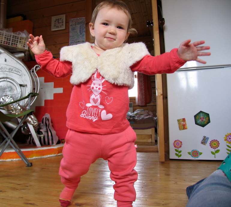 Викся - на этой неделе впервые переступила порог комнаты - они у нас высокие, до этого перелезала с помощью рук; сказала "дези" - это типа "держи") С речью пока не очень в целом, много слов в пассиве - знает и понимает уже много чего, но сама говорит пока только несколько слов. Ну и ладно, я не парюсь и ее не тороплю.
