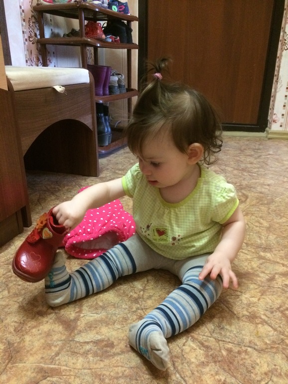 Кристине так понравилось гулять самой, что сегодня она с утра начала ходить за мной со штанишками в одной руке и ботинком в другой:) Как бы намекает девушка. А потом и вовсе уселась на пол в прихожей и стала собираться сама:))