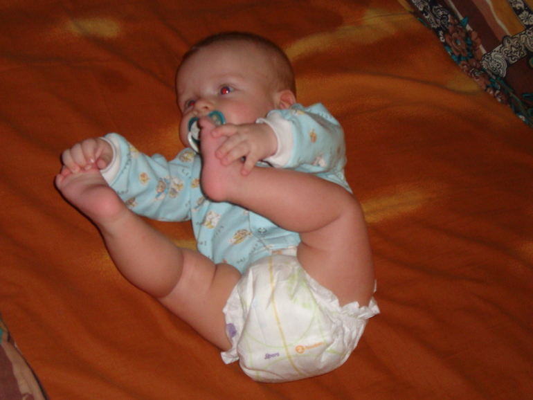 Ну вот... дотянулись и до ножек 4 месяца 15 дней, сначала Санёк просто их к верху поднимал, теперь хватает за пальцы и держит, до ротика еще не дотягиваем, живот мешает)))))) но это не за горами. Как только голышом, ноги верх и играть. Жаль фотоаппарат папа в командировку увёз.