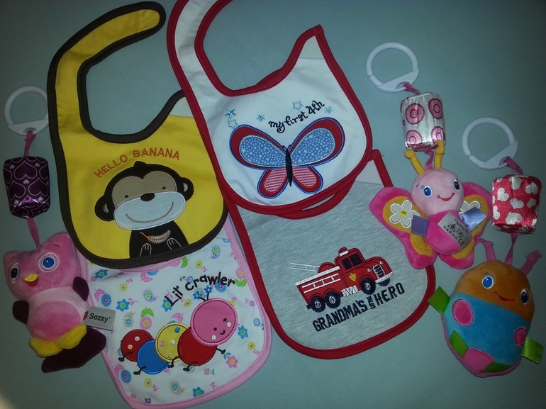 Есть слюнявчик, но розовый c гусеницей, светлячок и погремушка playgro. вот здесь посмотрите: http://www.babyblog.ru/community/post/sale/3636789