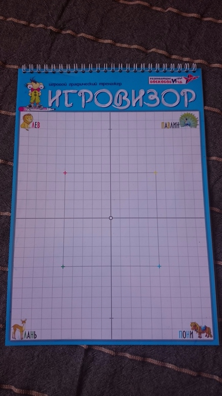 Игровизор Воскобовича представляет собой два скрепленных пружиной «листа» формата А4. Первый лист - ламинированный картон (к сожалению, не очень плотный) расчерченный в клетку. На верхних и нижних углах листа расположены животные, для лучшего ориентирования на листе: левый верхний угол - лев, левый нижний угол - лань, правый верхний угол - павлин, правый нижний угол - пони. Второй лист - прозрачный пластик, по которому предстоит рисовать маркером на водной основе. Между «листами» помещаем страницы развивающих пособий или просто распечатанные задания и выполняем их. Или просто рисуем по верхнему листу.