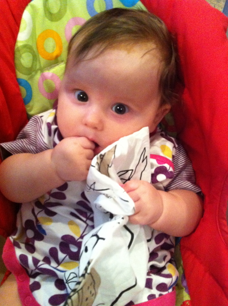 освоила сосательно-лобызательный способ знакомства с новым (тряпочки, погремушки, собственная одежда должны быть обязательно попробованы на вкус),
